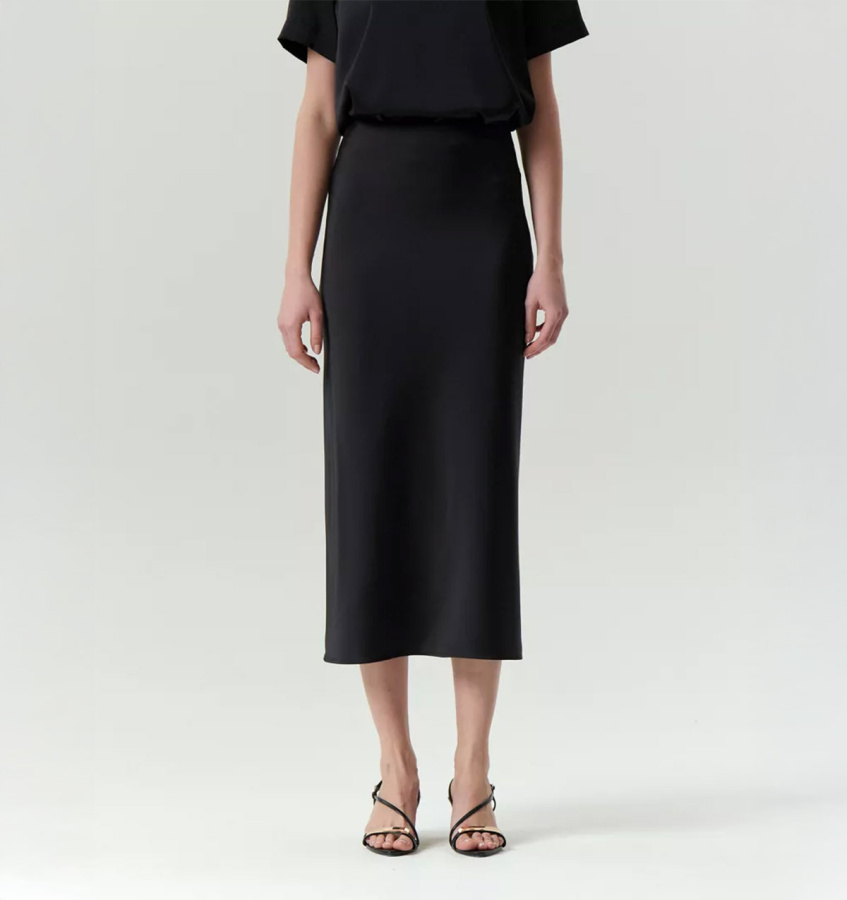 Универсальная чёрная юбка А-силуэта в длине миди поддержит образ как на каждый день, так и на особый случай. Модель имеет высокую посадку. Выполнена из струящегося материала с содержанием вискозы, без подкладки. Застёгивается на молнию сбоку.