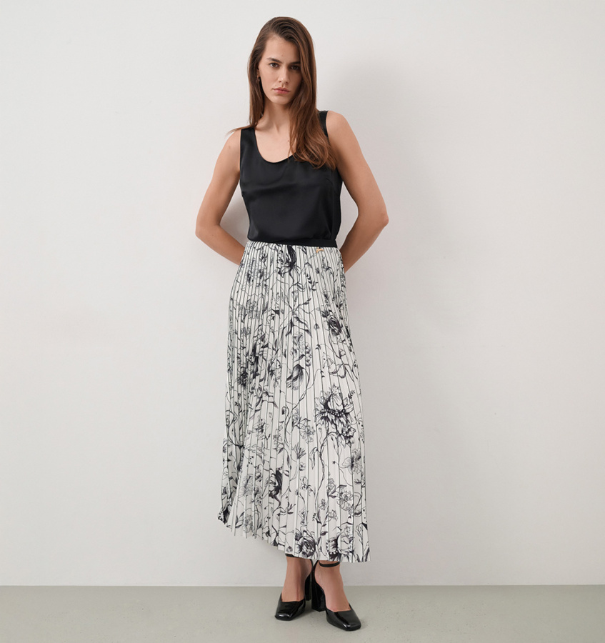 Актуальная и женственная юбка-миди белоснежного оттенка. Модель А-силуэта из плиссированной ткани дополнена ДНК-принтом и нежной подкладкой - часть новой Premium-коллекции. Нежный флоральный принт, нарисованный тонкими линиями, придаёт образу особую лёгкость и поэтичность.