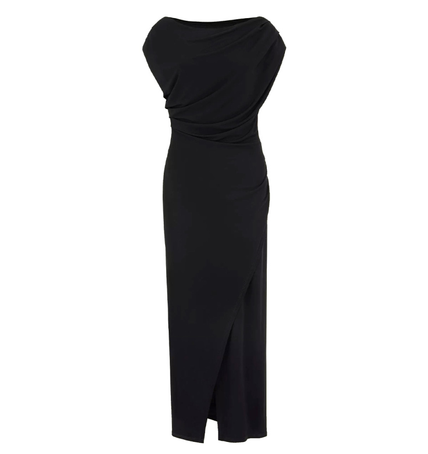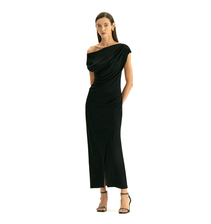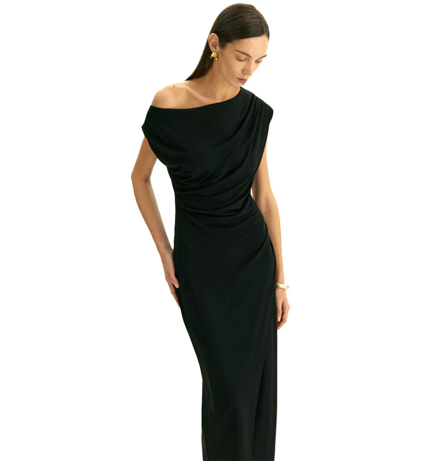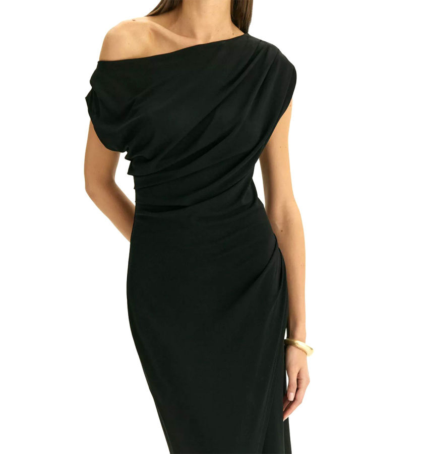 Элегантное платье в чёрном цвете из мягкой вискозы сделает повседневные выходы звёздными. Оно также станет подходящим вечерним вариантом для ужина в ресторане или выхода в театр. Главная изюминка платья — изысканные драпировки, которые скорректируют особенности, подчеркнут достоинства и зададут настроение образа. Платье позволяет приспустить одно плечо, чтобы образ стал ещё эффектнее. Эффект запаха в области бёдер акцентирует женственные пропорции. Модель выполнена без рукава со спущенным плечом и вырезом-лодочкой, имеет универсальную длину миди. Платье сделано без застёжки и без подкладки.