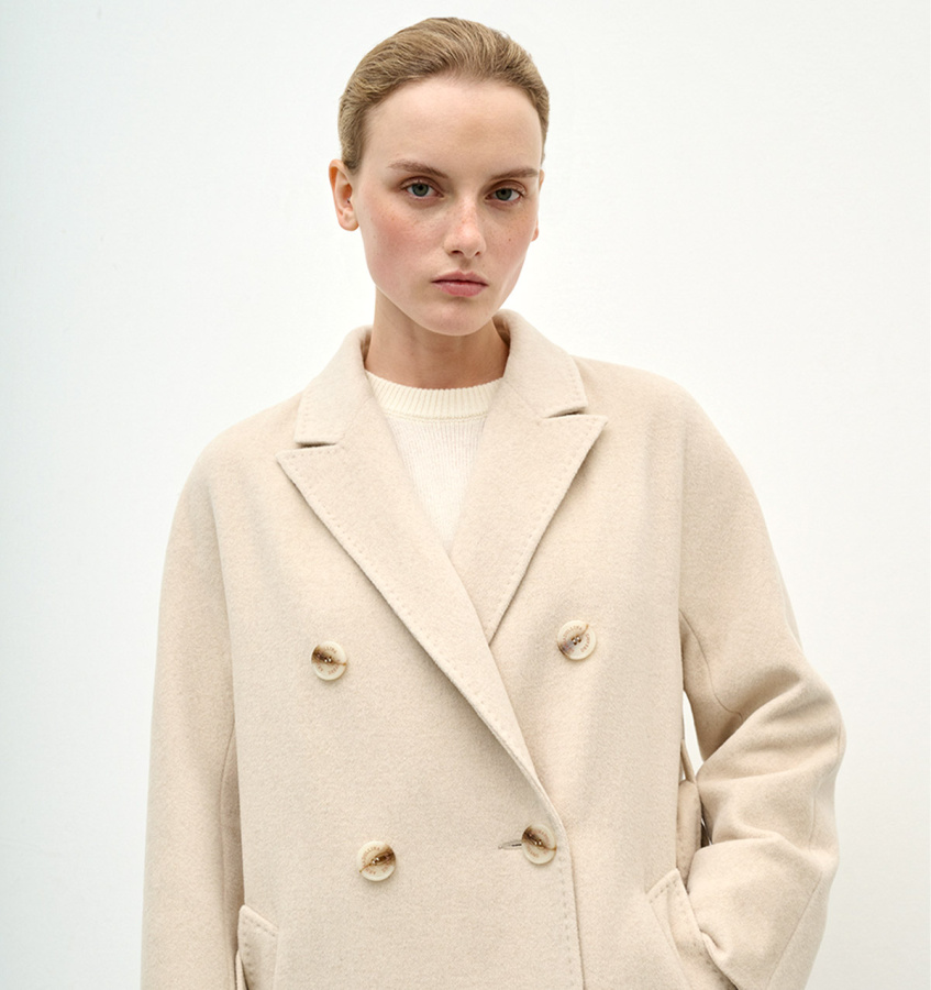 Двубортное шерстяное пальто в классическом стиле. Сдержанная модель длиной миди с английским воротником, двубортной застежкой на пуговицы и прорезными карманами.