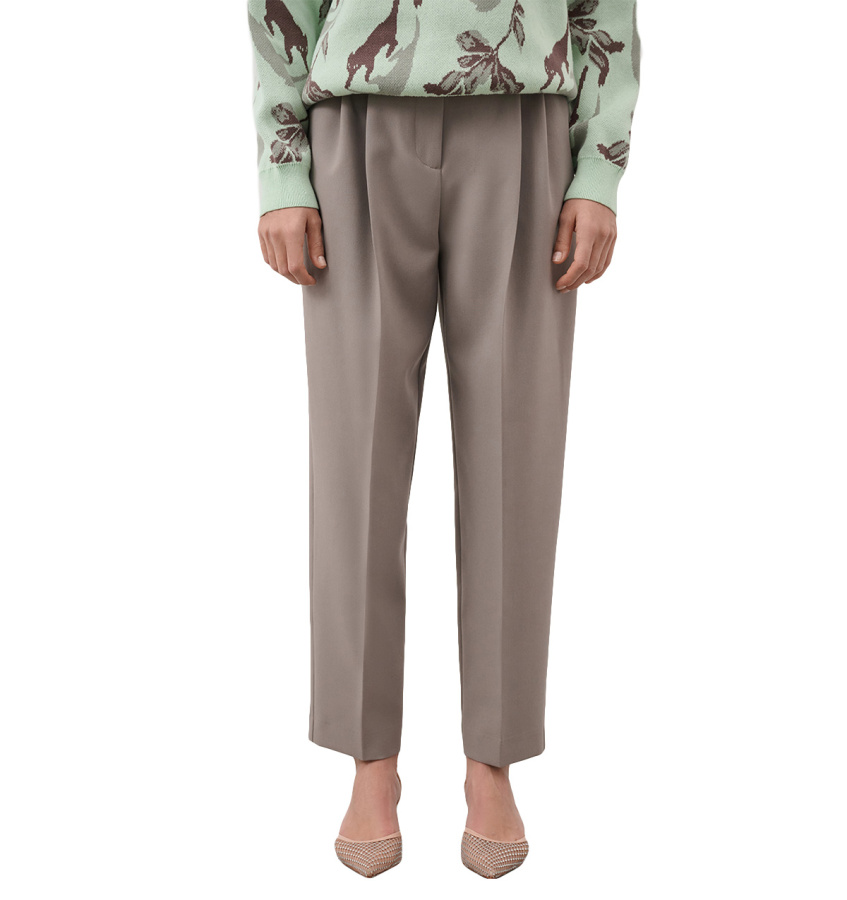 Стильные брюки бежевого оттенка с защипами у пояса и шлевками для ремня. Прямая модель с высокой посадкой по талии и декоративными защипами, образующими мягкие складки.