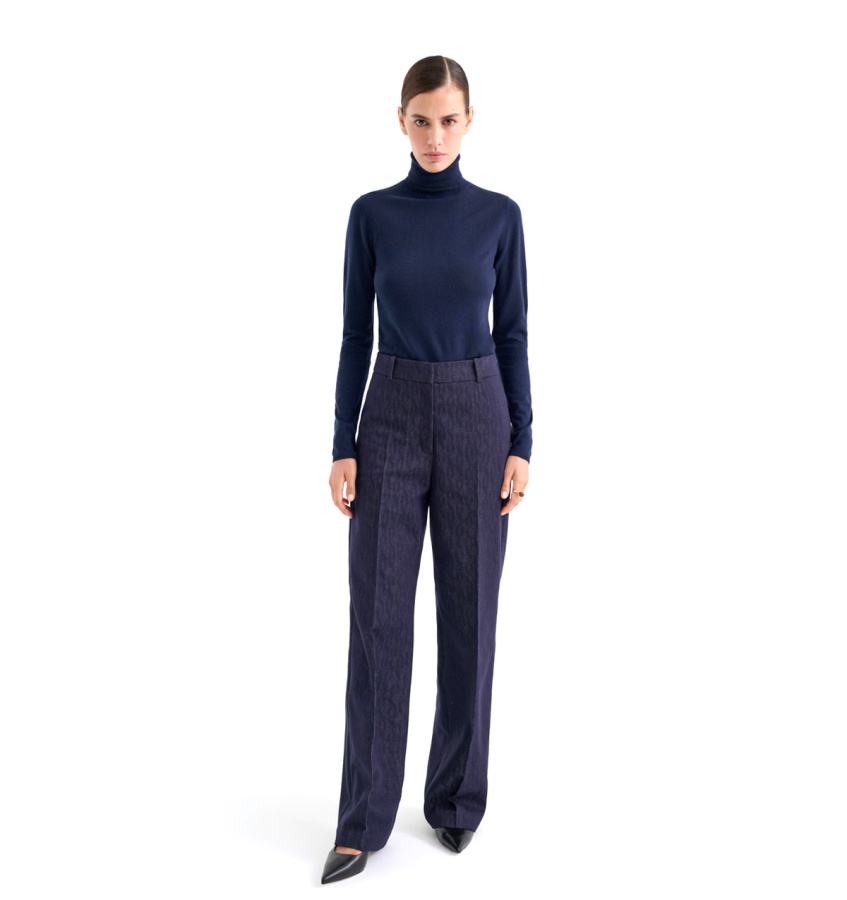 Джемпер синего оттенка выполнен из 100% мериносовой шерсти. Базовая модель облегающего силуэта с воротником-стойкой.