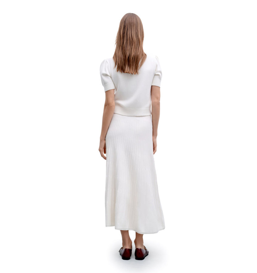 Женственный джемпер молочного оттенка. Модель прямого кроя с укороченными рукавами выполнена из тонкой мериносовой шерсти и вискозы.