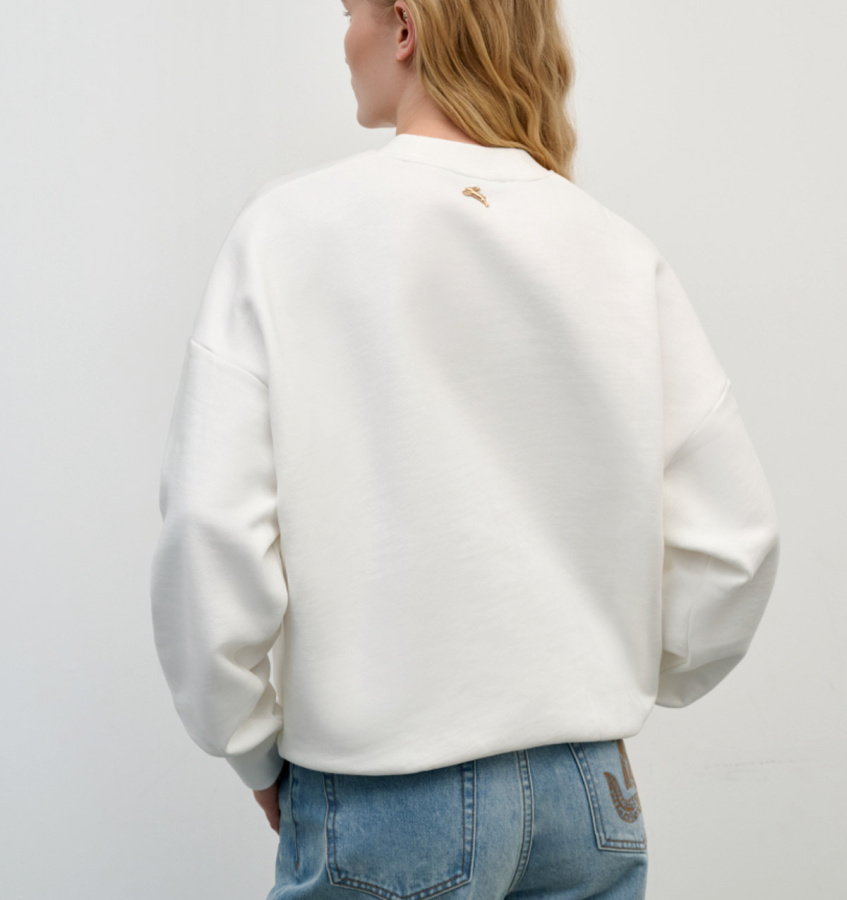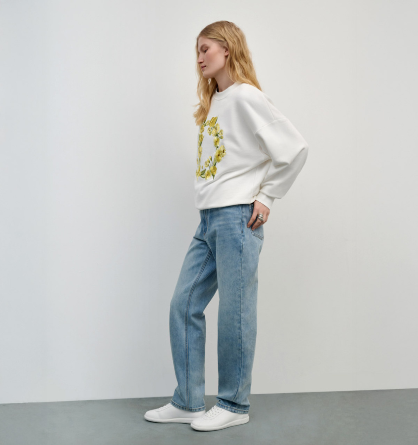 Уютная толстовка из мягкого хлопка с авторским принтом – универсальный предмет повседневного гардероба. Модель прямого силуэта с классическим круглым вырезом, плотными манжетами и уплотненной вставкой по низу.
