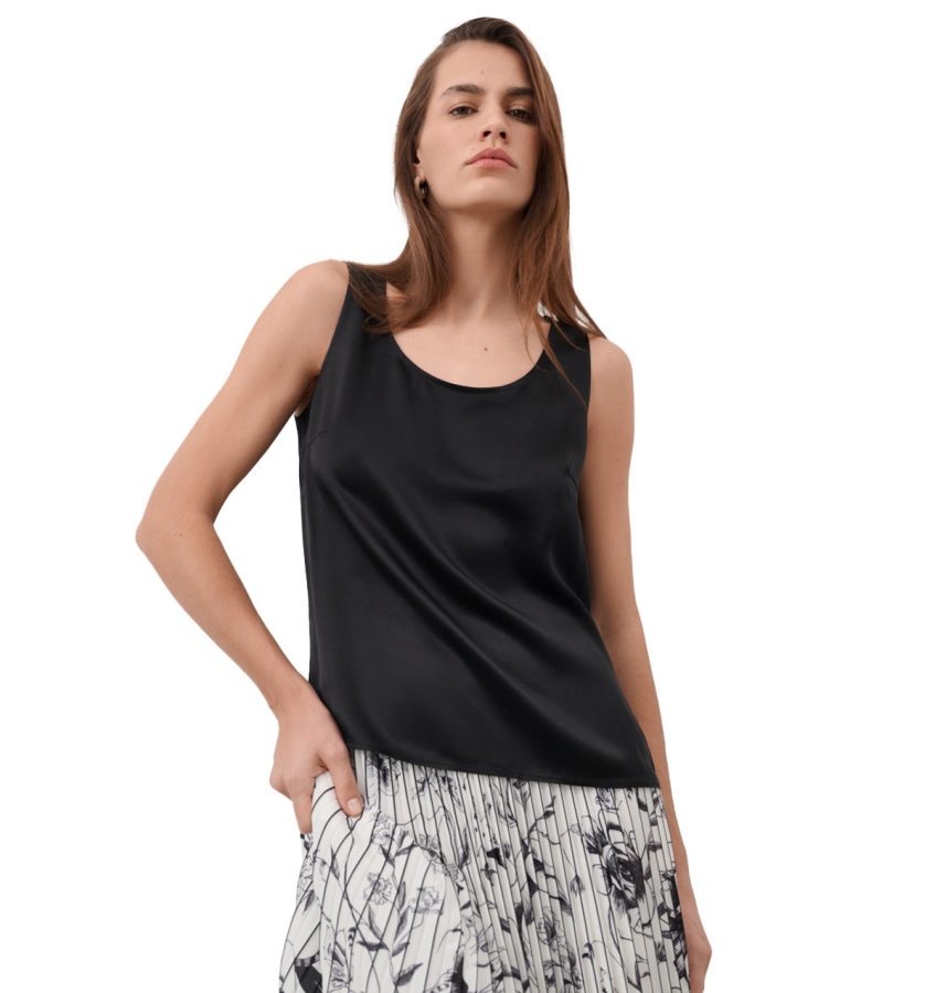 Лаконичный топ глубокого черного цвета. Модель лаконичного кроя выполнена из высококачественного шелка, что обеспечивает идеальную посадку и комфорт.