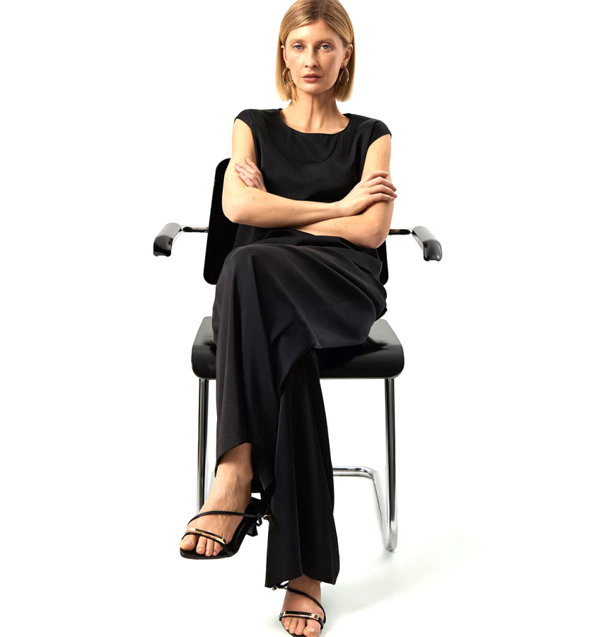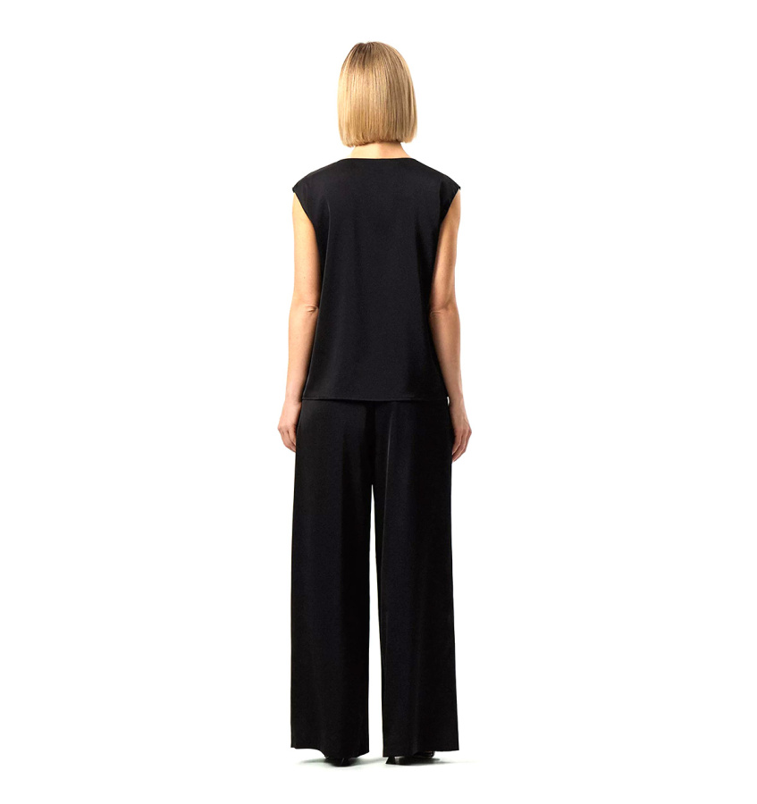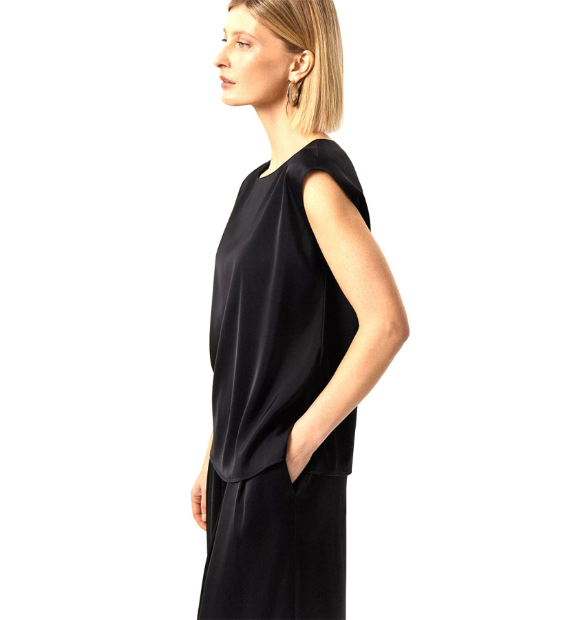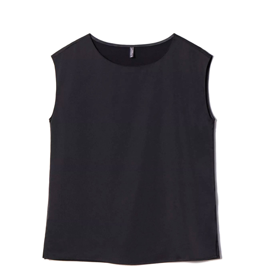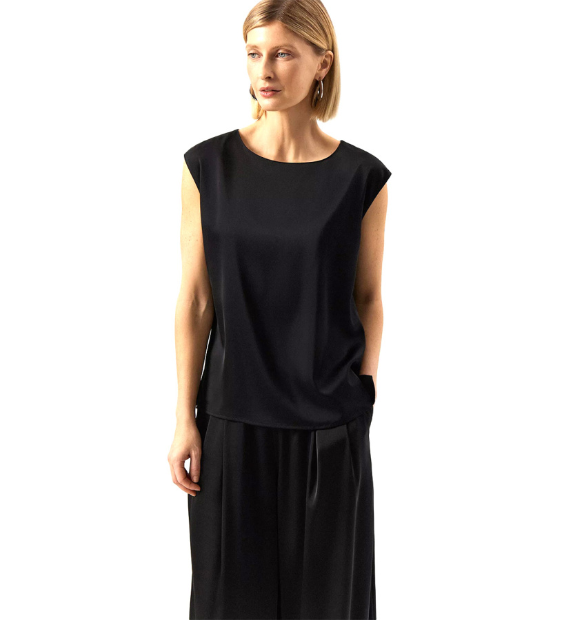 Базовый чёрный топ без рукавов. Прямой силуэт подойдёт любому типу фигуры. Овальный вырез изделия открывает вид на ключицы и шею. Топ станет лаконичным дополнением к деловым и ежедневным образам.