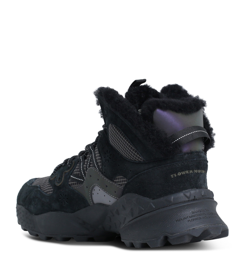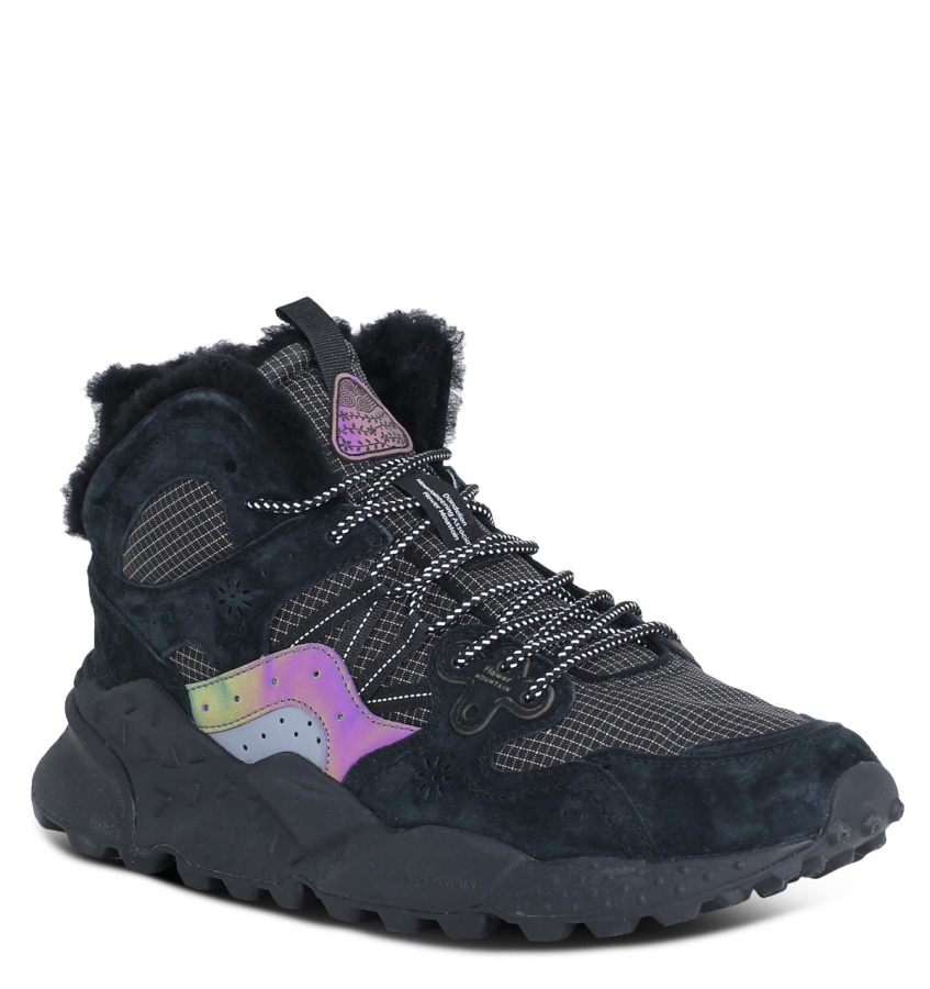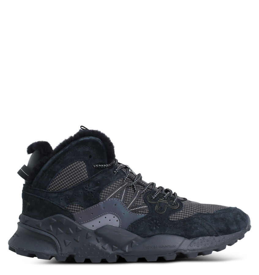 Зимние кроссовки Flower Mountain средней высоты с дизайном, вдохновленным моделями для активного отдыха, с верхом из ткани и замши, а внутренняя подкладка из натуральной шерсти. Боковая перфорация и усиленные люверсы сочетаются с двухцветными шнурками для треккинга. Съемная стелька из натуральной пробки анатомической формы с антибактериальной обработкой. Устойчивая резиновая подошва с зубчатым протектором.