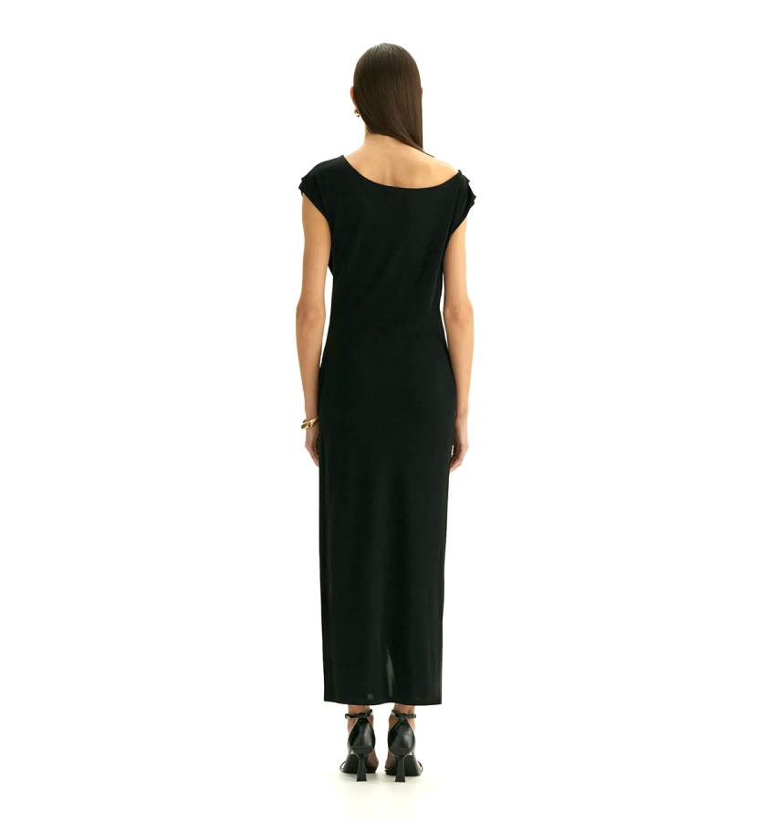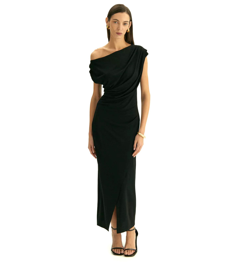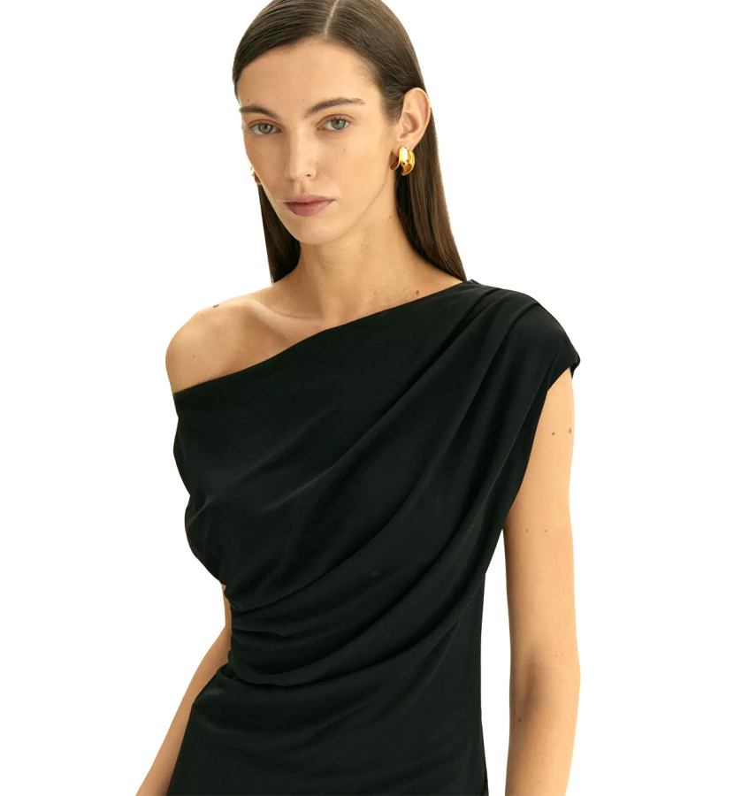 Элегантное платье в чёрном цвете из мягкой вискозы сделает повседневные выходы звёздными. Оно также станет подходящим вечерним вариантом для ужина в ресторане или выхода в театр. Главная изюминка платья — изысканные драпировки, которые скорректируют особенности, подчеркнут достоинства и зададут настроение образа. Платье позволяет приспустить одно плечо, чтобы образ стал ещё эффектнее. Эффект запаха в области бёдер акцентирует женственные пропорции. Модель выполнена без рукава со спущенным плечом и вырезом-лодочкой, имеет универсальную длину миди. Платье сделано без застёжки и без подкладки.