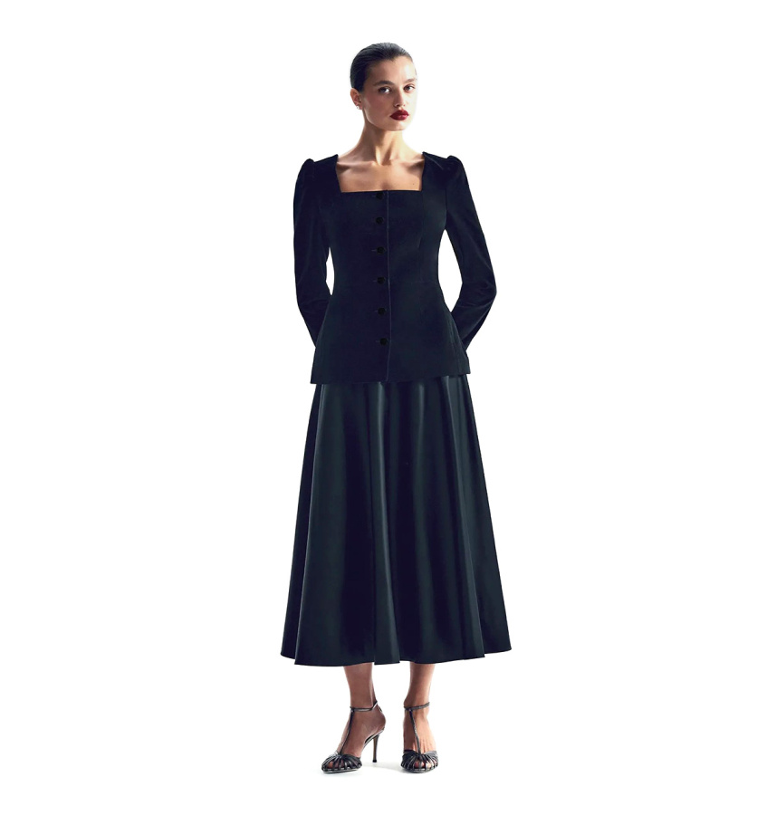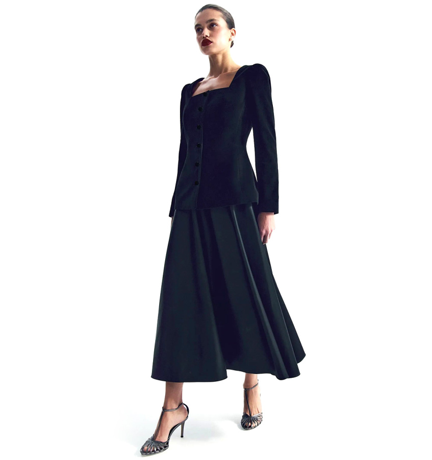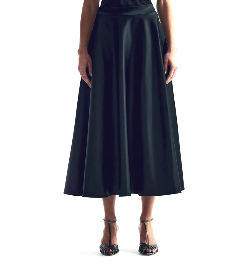 Чёрная длинная юбка-полусолнце с высокой посадкой станет основой множества нарядных образов.