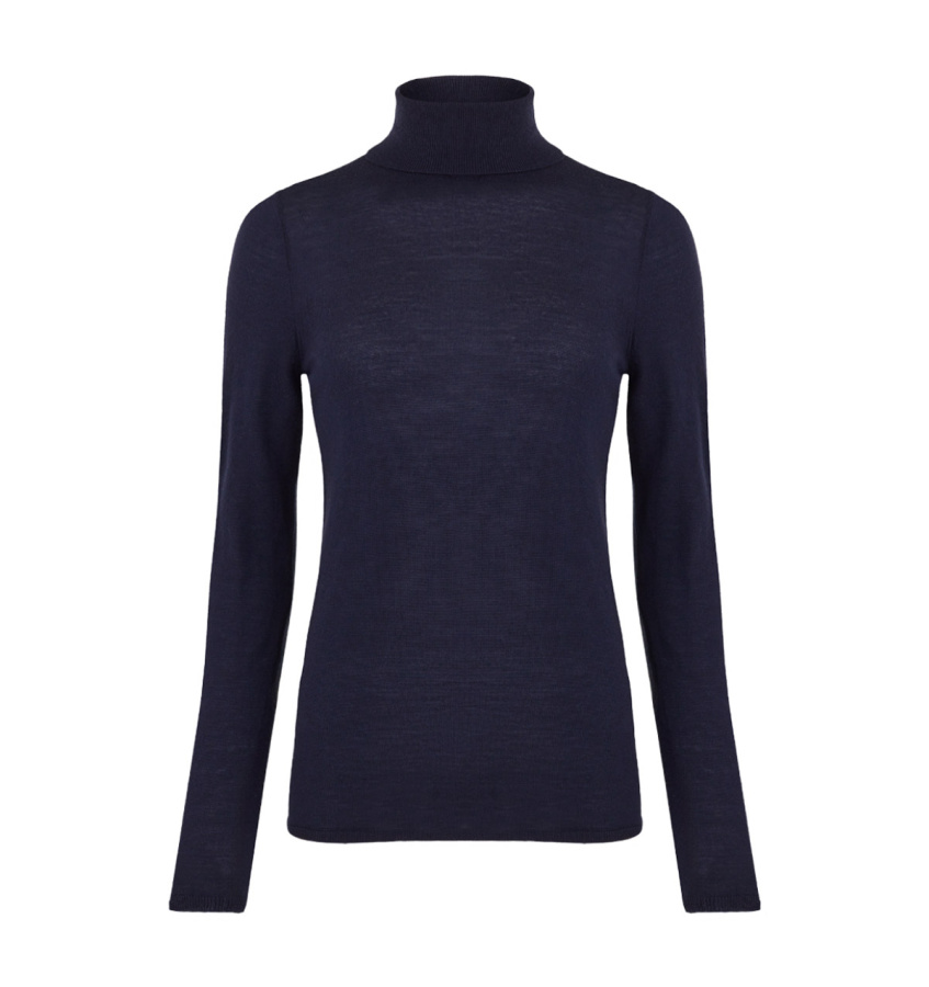 Джемпер синего оттенка выполнен из 100% мериносовой шерсти. Базовая модель облегающего силуэта с воротником-стойкой.