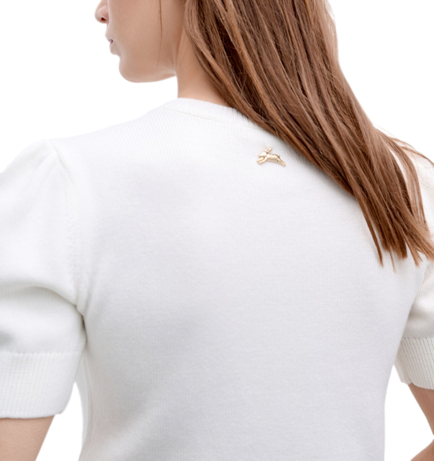 Женственный джемпер молочного оттенка. Модель прямого кроя с укороченными рукавами выполнена из тонкой мериносовой шерсти и вискозы.