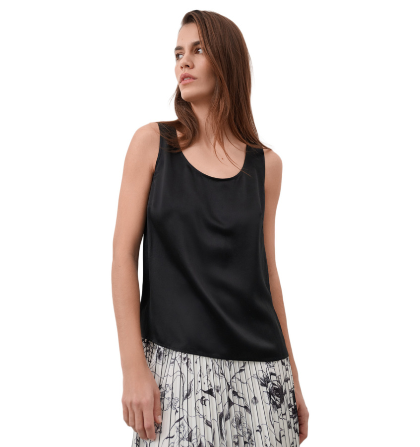 Лаконичный топ глубокого черного цвета. Модель лаконичного кроя выполнена из высококачественного шелка, что обеспечивает идеальную посадку и комфорт.